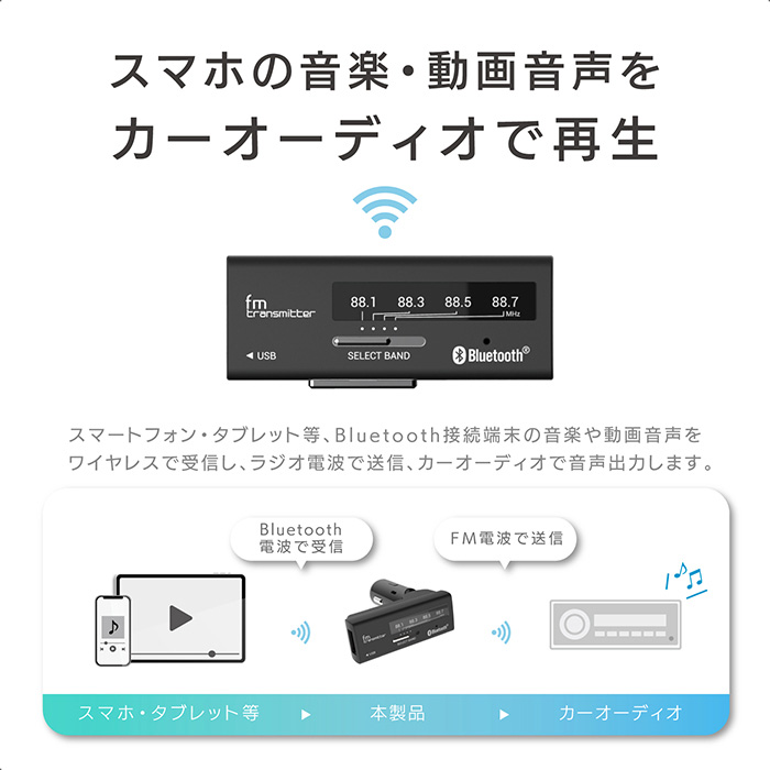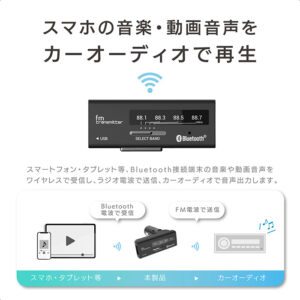 ●Bluetooth対応のスマートフォン/iPhoneの音楽やワンセグ音声をワイヤレスで受信、さらにワイヤレスでFMラジオに送信。