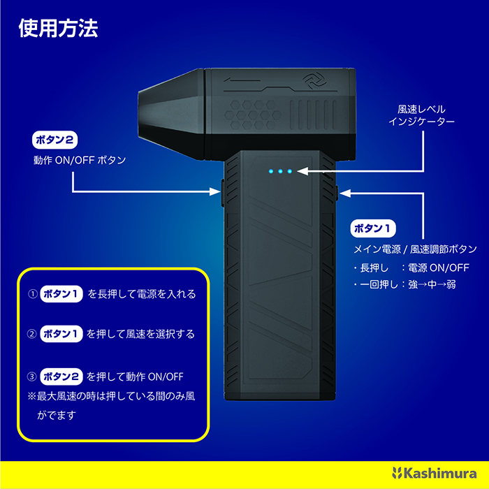 2500mAhのリチウムイオンバッテリー内蔵、コンパクトでパワフルなUSB充電式のミニブロワー