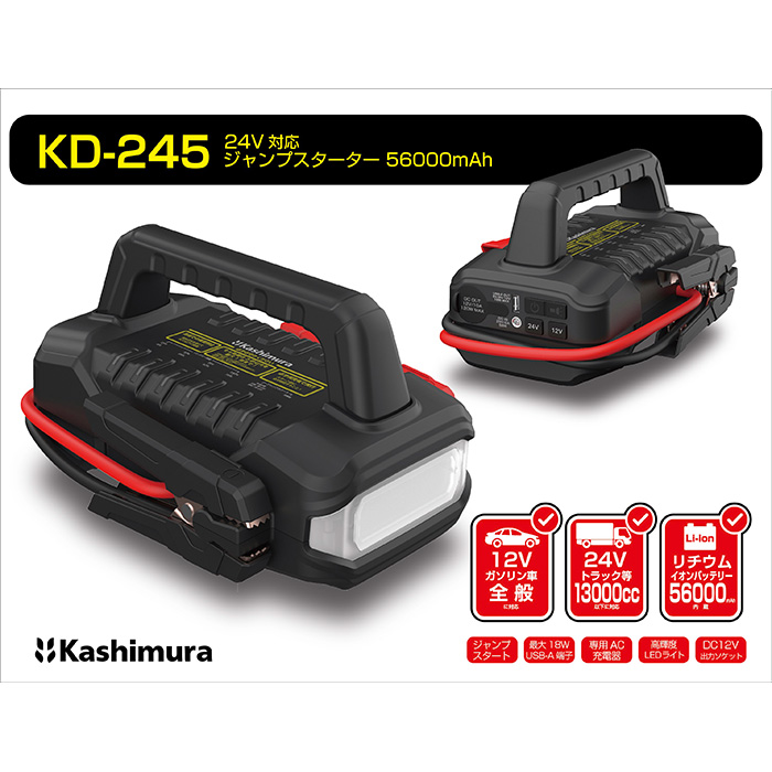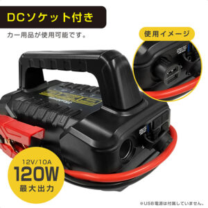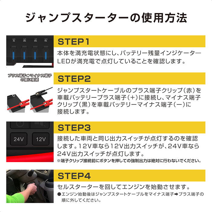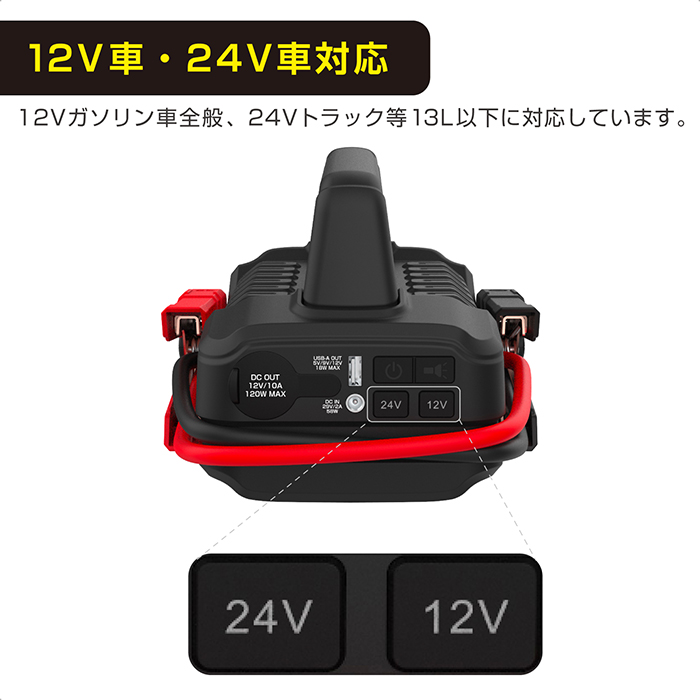 | ジャンプスタート対象車の目安 | DC12Vガソリン車全般 DC24Vトラック等(13000cc以下) |