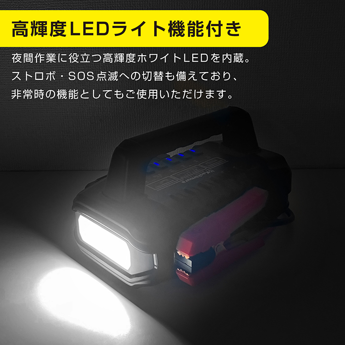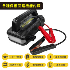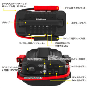 | 定格出力 ジャンプスターター | DC12V:600A~900A(始動電流~ピーク電流) DC24V:800A~1500A(始動電流~ピーク電流) |