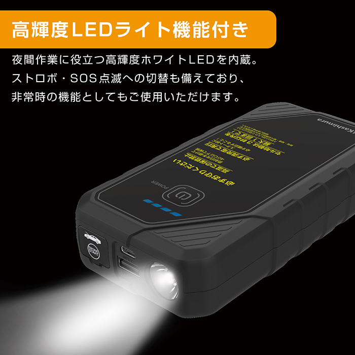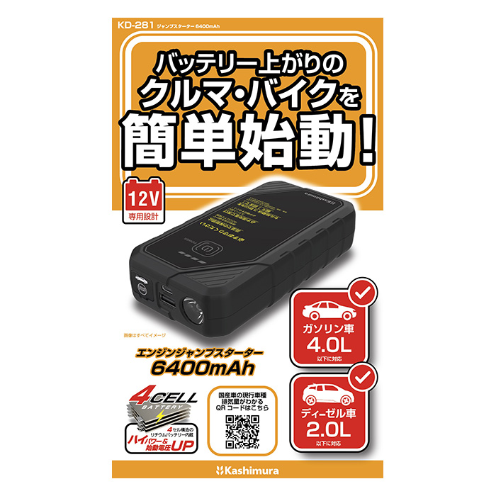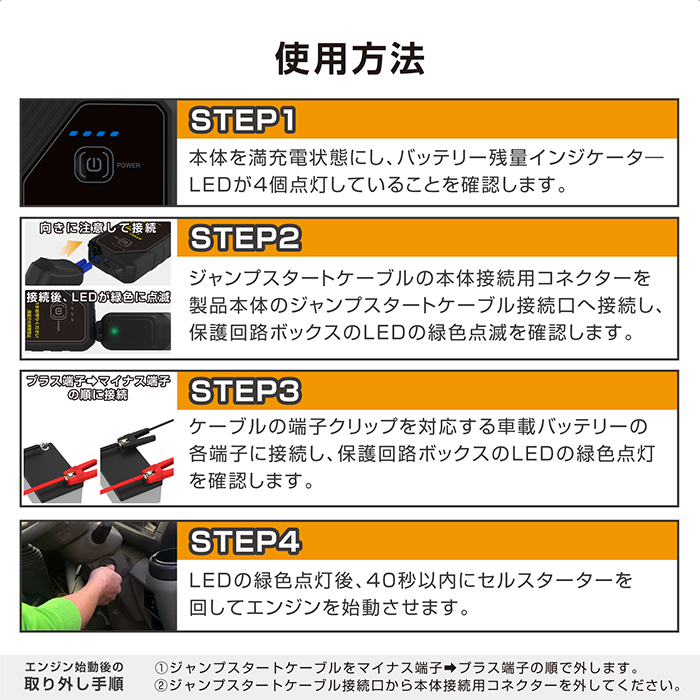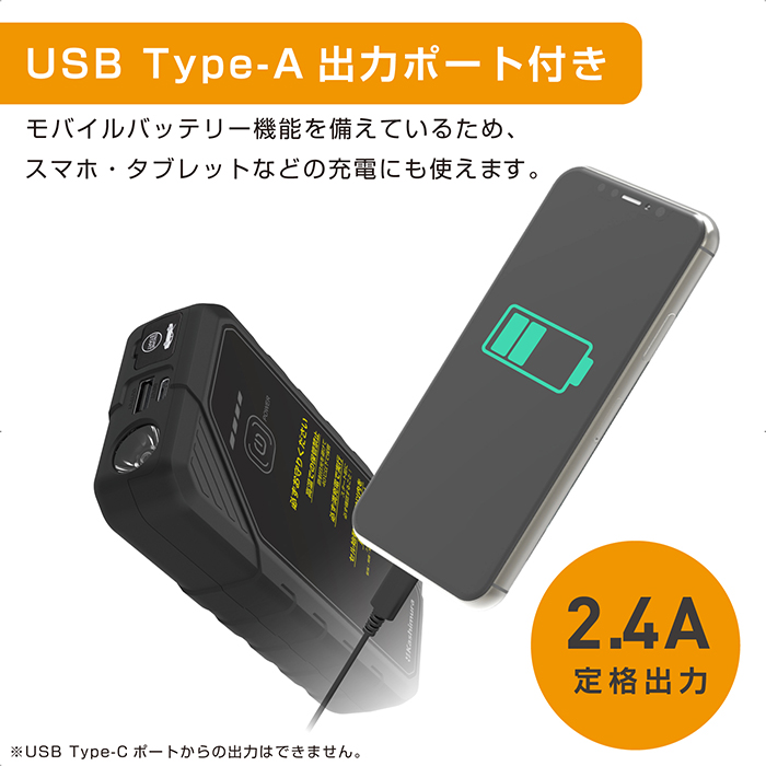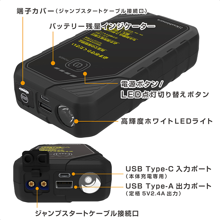 | ジャンプスタート対象車の目安 | 2輪/4輪ともにDC12V ガソリン車:4.0L以下 ディーゼル車:2.0L以下 |