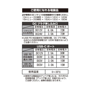 | 定格電圧/電流 DCプラグ | DC12V / 最大6Aまで DC24V / 最大3Aまで ※USB PD対応端末をご使用の際、DCプラグ挿し込み口との合計定格電力が120Wを超えないようご注意ください。 |