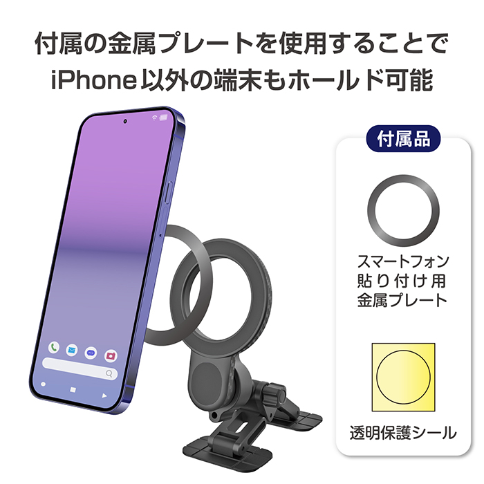 付属の金属プレートを使用することでiPhone以外の端末もホールド可能。