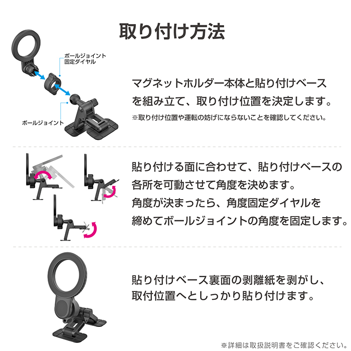 貼り付けベースは曲面にも貼れる軟質素材を採用。2箇所の貼り付け面でしっかり固定します。