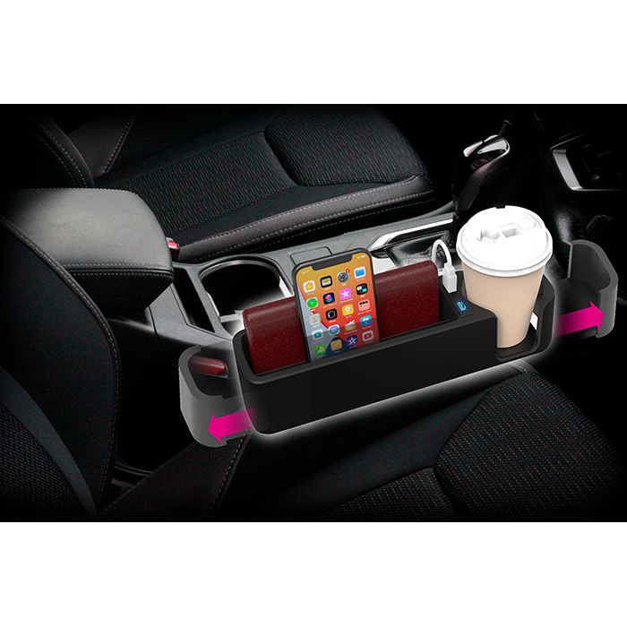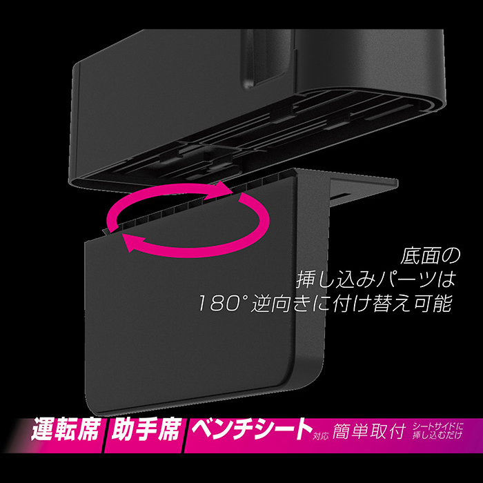 シートサイドの隙間に挿し込むだけで、収納ポケットとドリンクホルダーを増設可能。
