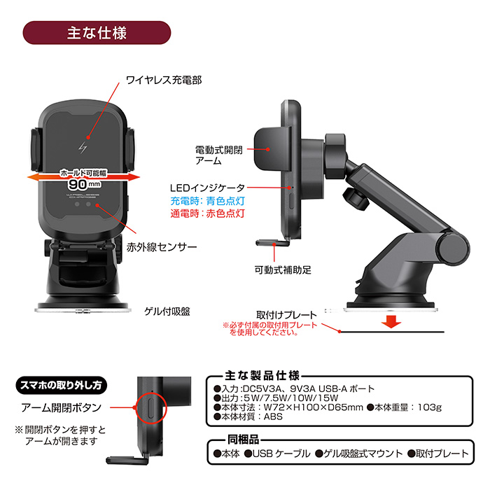 自動開閉式 ワイヤレス充電ホルダー 吸盤取り付け