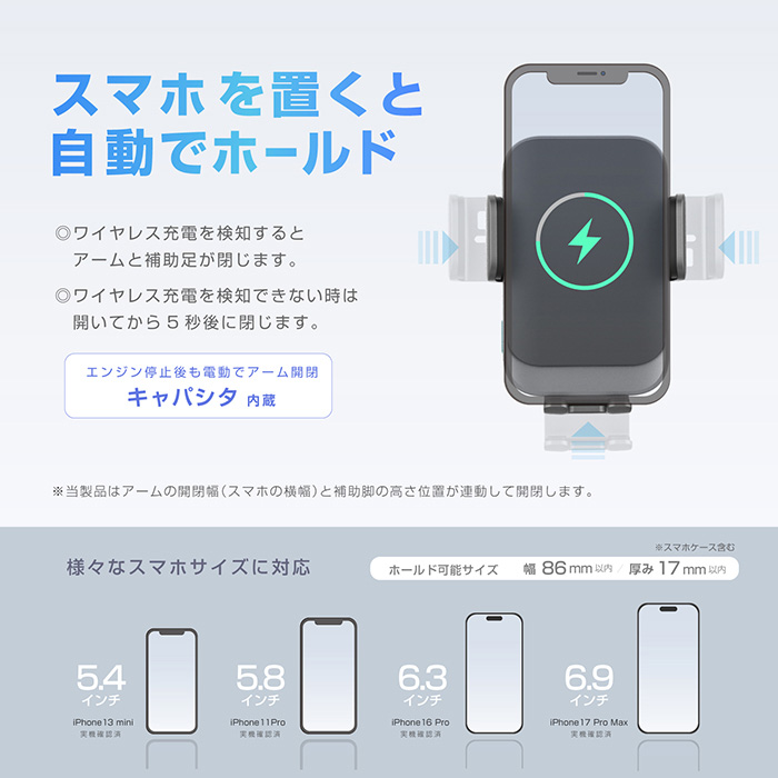 ※ワイヤレス充電を検知できないときはアームが開いてから5秒後に閉まります。