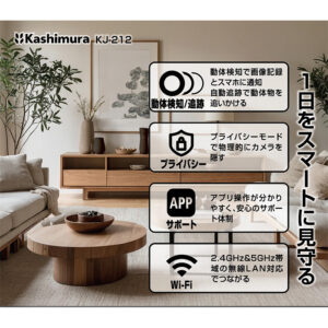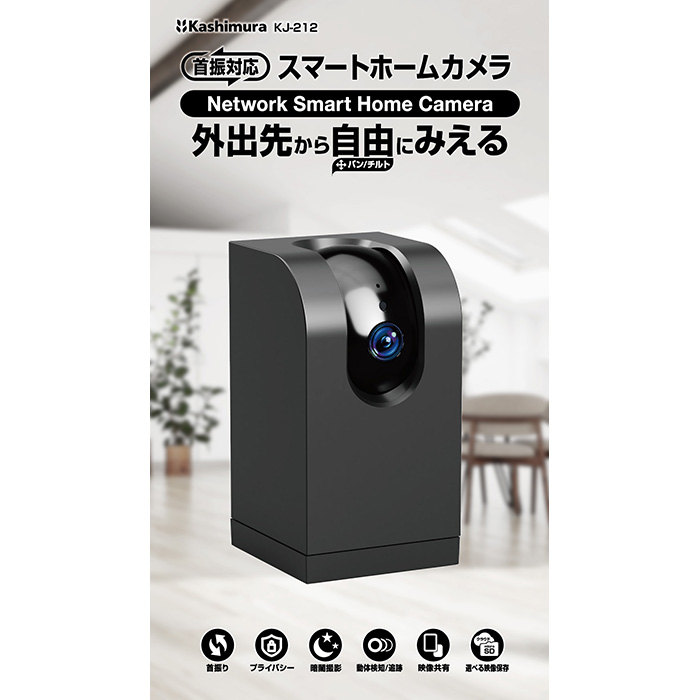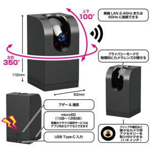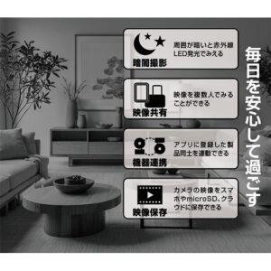 外出先からスマートフォンで室内をリアルタイムで確認できるスマートカメラ。
