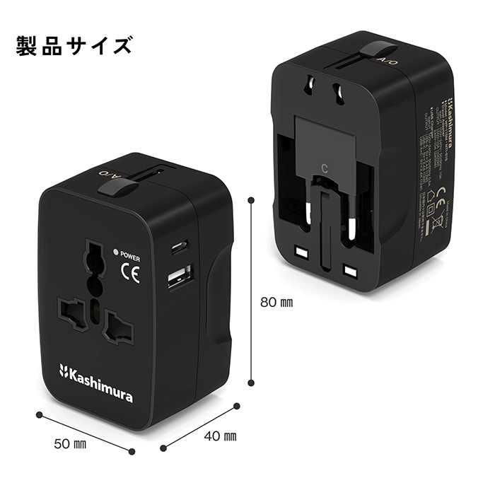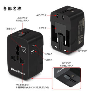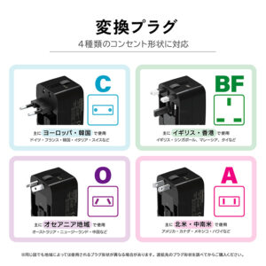 4種類の電源コンセントに対応する変換プラグ。(A,C,O,BF)USB Type-Aポート+USB Type-Cポート搭載。