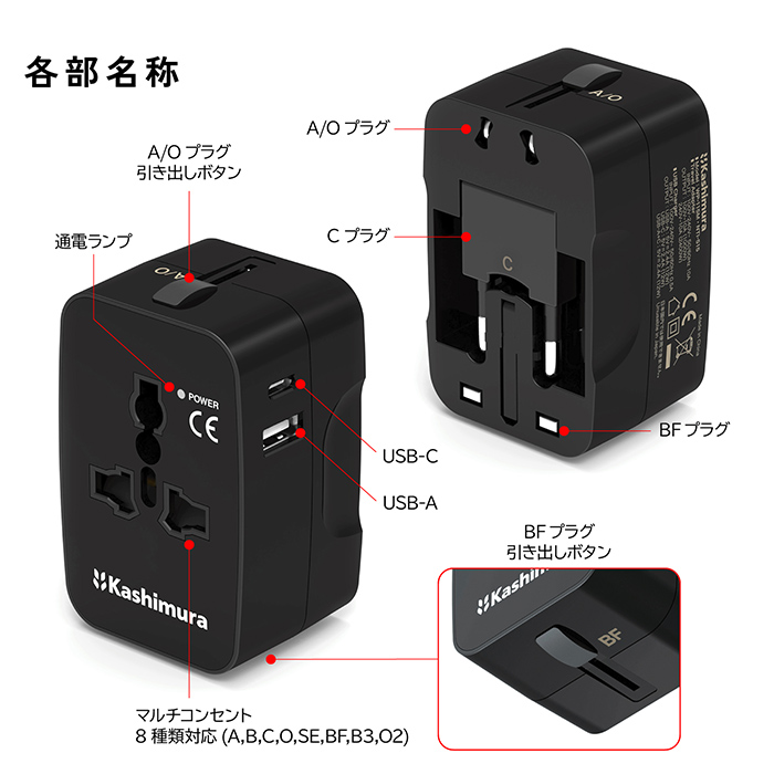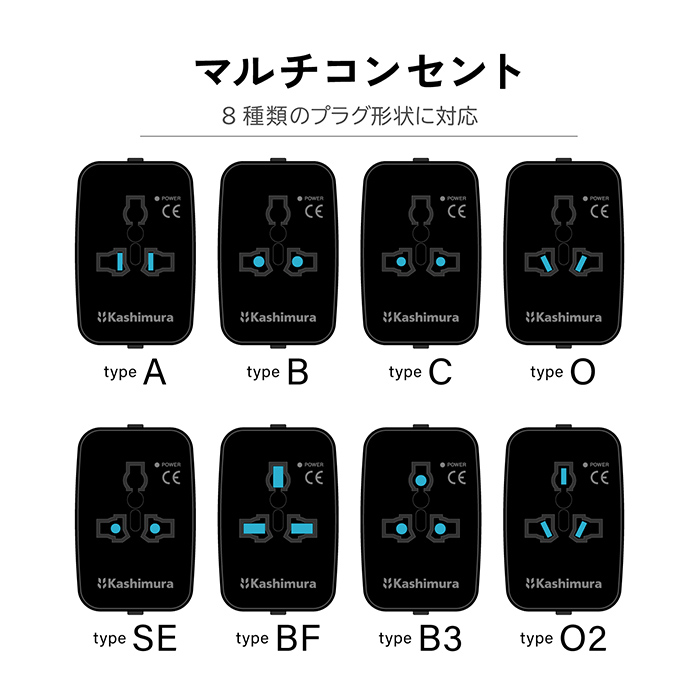 8種類のプラグ形状に対応。(A/B/C/O/SE/BF/B3/O2)