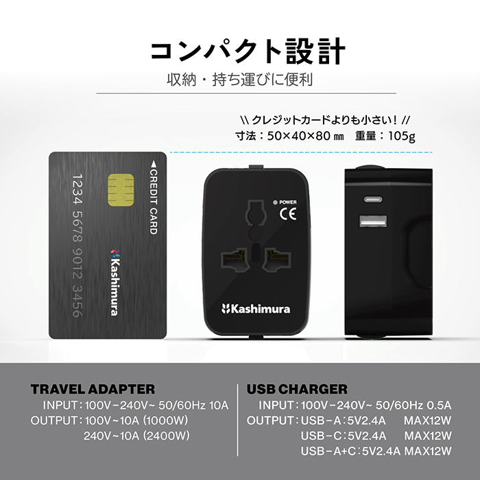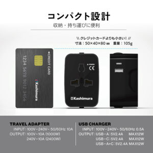 変換プラグとUSB電源、1台2役で海外旅行に最適。