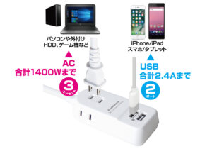 ●3口のACコンセントとUSB2ポートで最大5製品の使用が可能。USBポート付き電源タップです。