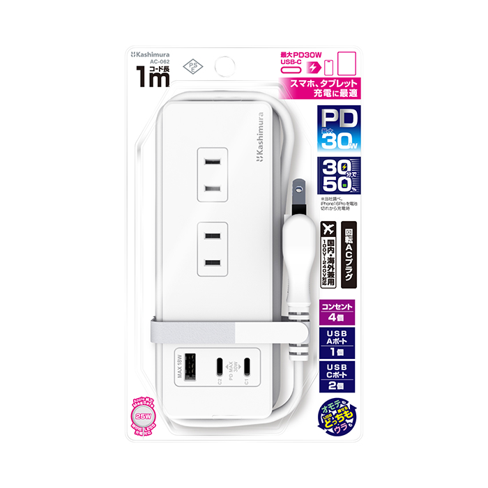 電源タップAC4 USBA+C2 PD30W 1m リバーシブル