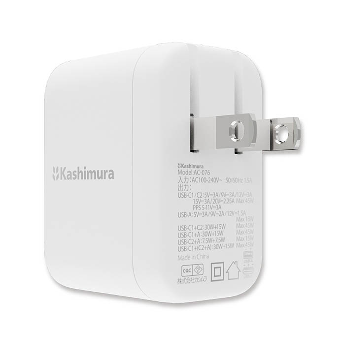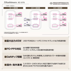 | 出力:USB 1ポート単独使用時 | ・USB-C1/C2ポート PD45W(5V 3A,9V 3A,12V 3A,15V 3A,20V 2.25A) PPS33W (5~11V 3A) ・USB-Aポート 18W (5V 3A,9V 2A,12V 1.5A) |