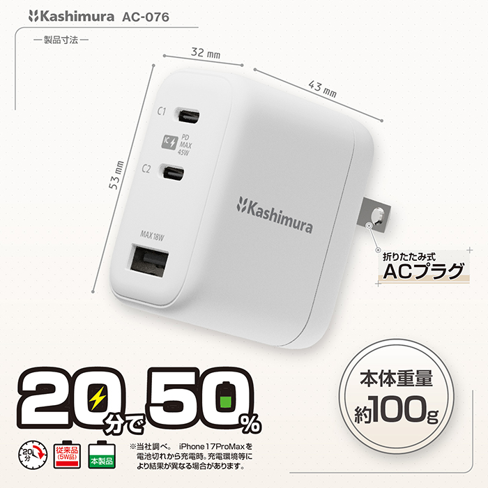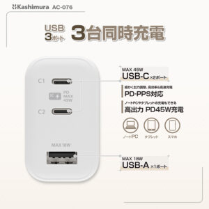 持ち運びに便利な、USB PD対応USB Type-C 2ポート+USB Type-A 1ポート搭載のAC充電器。