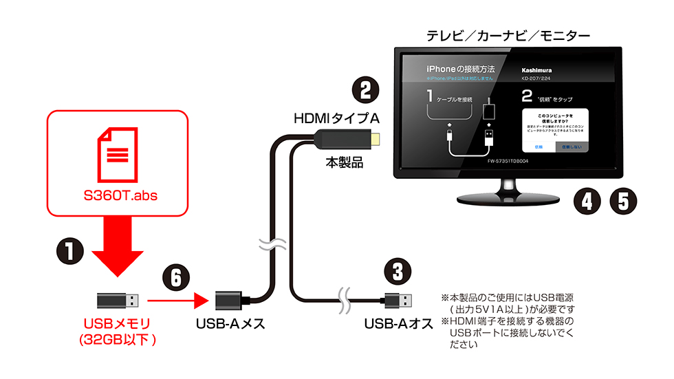 1.USBメモリに指定のアップデートファイル (S360T.abs) を保存してください。