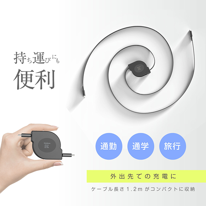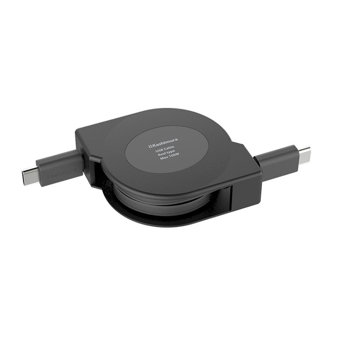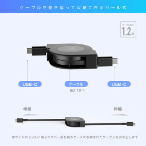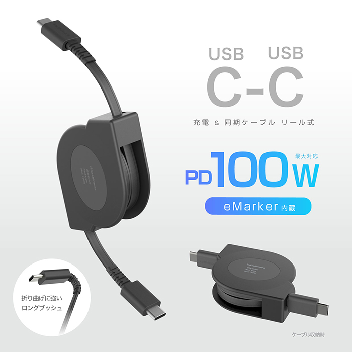 USB充電&同期ケーブル リール1.2m C-C PD100W BK
