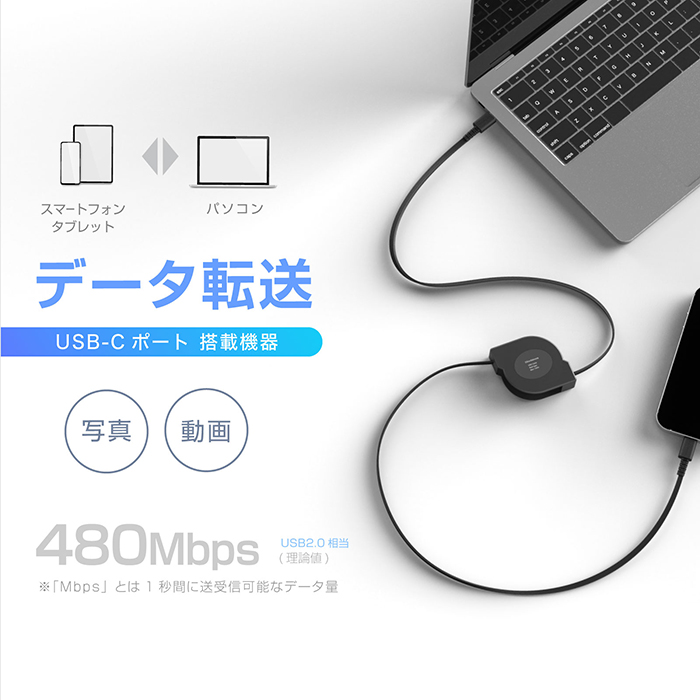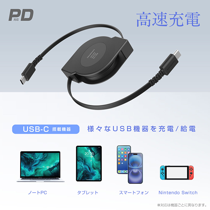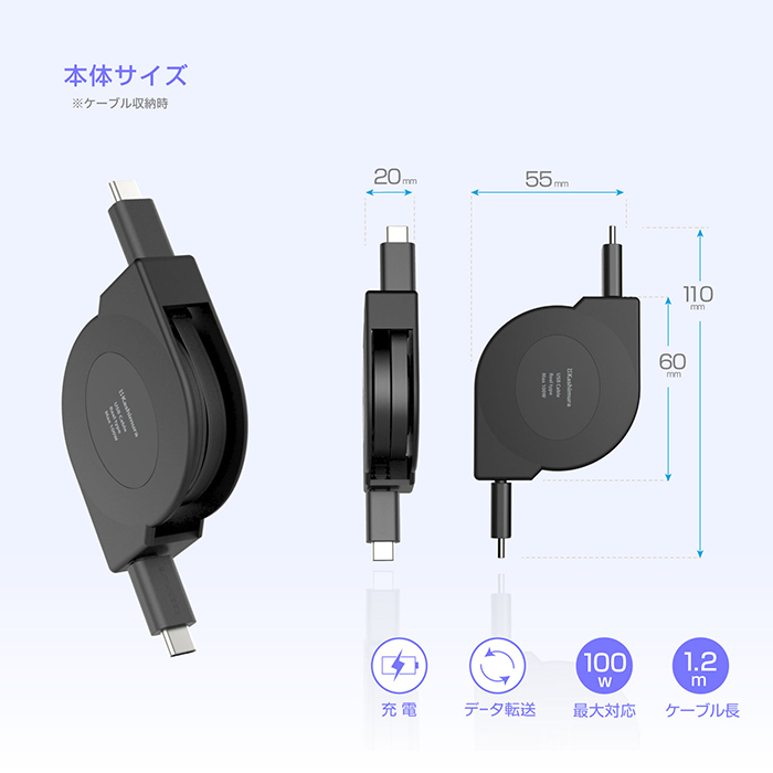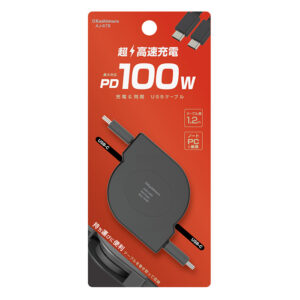 USB-PD 最大対応 100W(20V5A)。コードをスッキリ収納できる巻き取り式。