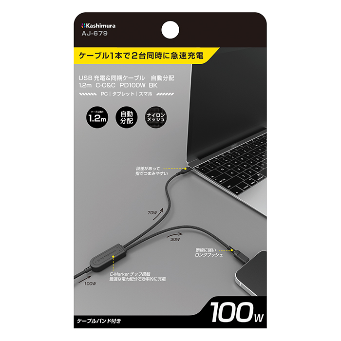 USB充電&同期ケーブル 自動分配1.2m C-C&C PD100W BK