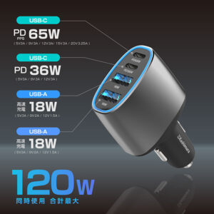 | 出力 同時使用時 | ■各ポートの合計が120W未満の場合 各ポート出力を落とさず最大対応。 (最大対応: C1-65W,C2-36W,A1-18W,A2-18W) ■各ポートの合計が120W以上になる場合 合計120W以内になるようにICが自動でUSB-C2・A1・A2を出力調整します。 (最大対応: C1-65W,C2-25W,A1-15W,A2-15W) |