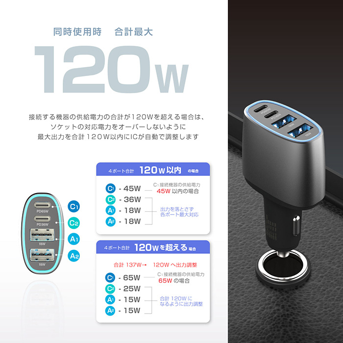 ※4ポート同時使用時:合計120W以内になるようにICが自動でUSB-C2・A1・A2を出力調整します。