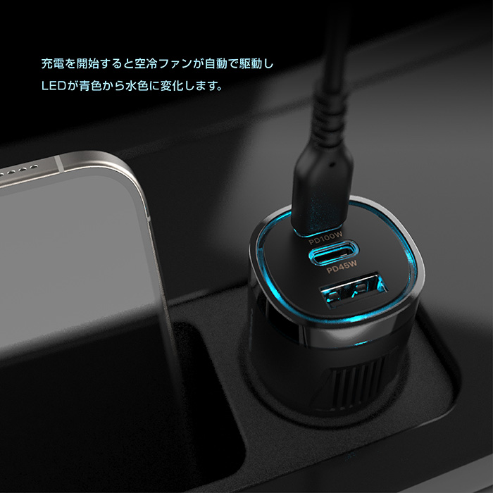 充電時 (空冷ファン駆動時) は水色LEDに色が変わります。