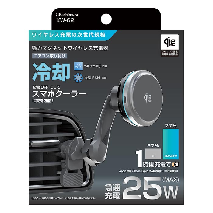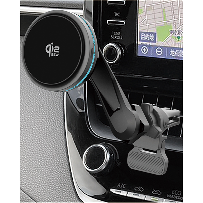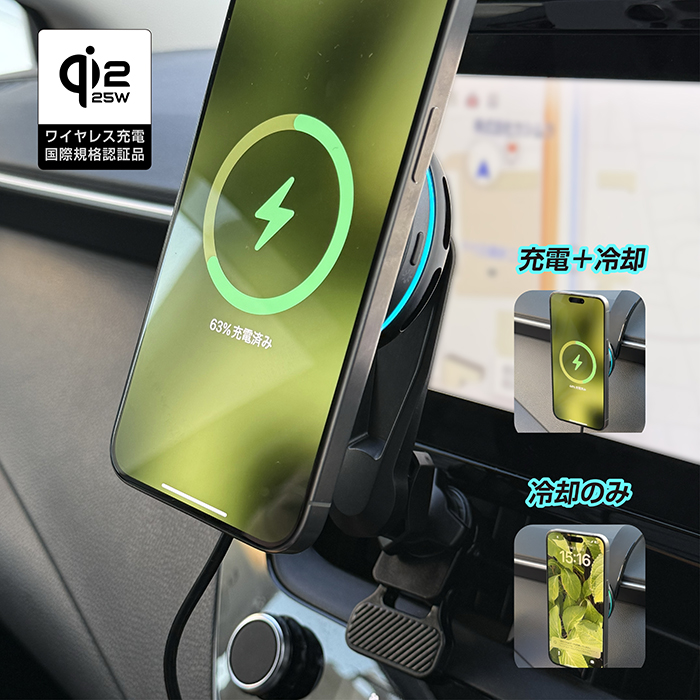 Qi2/25Wマグネットワイヤレス充電器 冷却機能 充電ON/OFF機能 ロングアーム エアコン取り付け