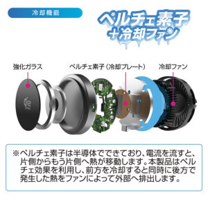 (充電器表面に強化ガラス採用、ペルチェ素子内蔵、冷却ファン付き。)