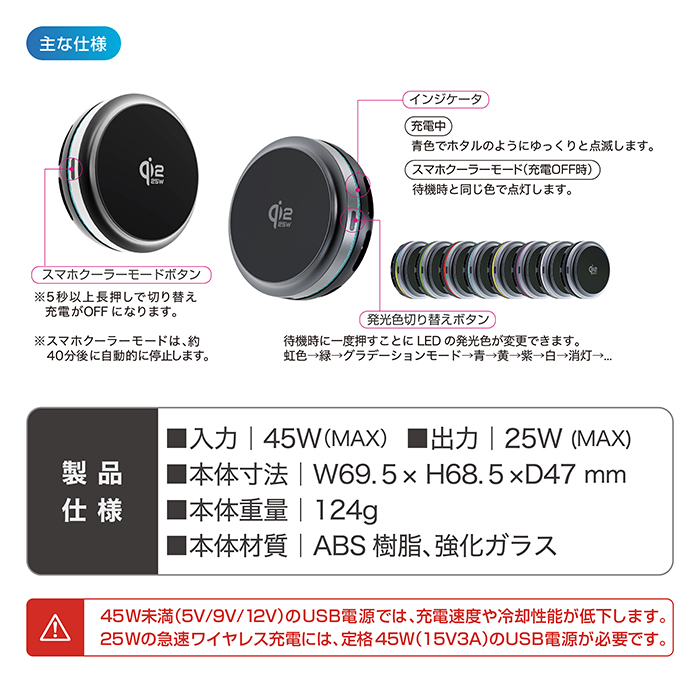 最大25W充電/Qi2マグネットワイヤレス充電器 冷却機能 充電ON/OFF機能。