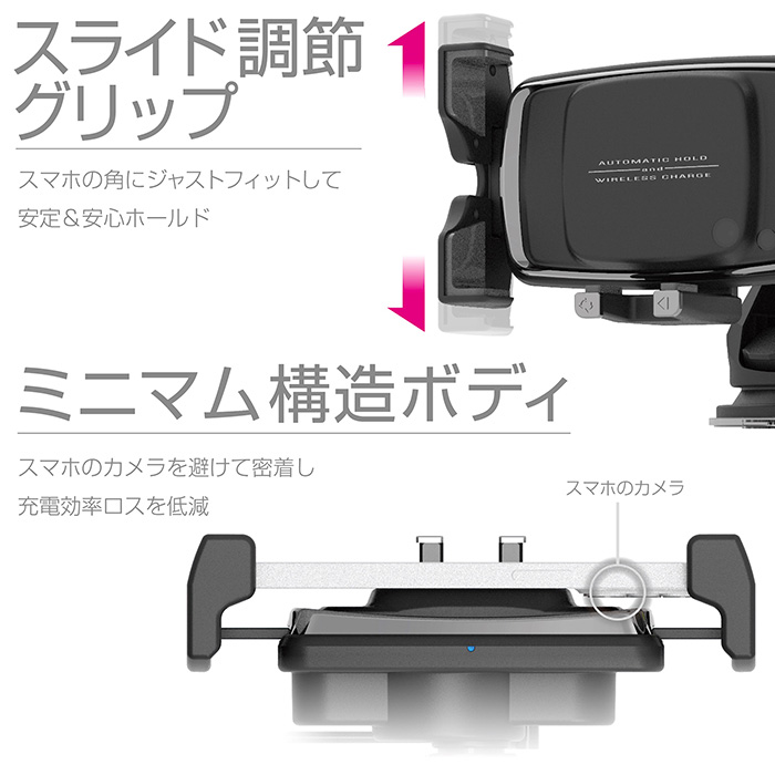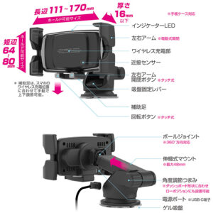 スマホを4角で自動ホールド。自動回転して縦/横置き。ワイヤレス充電&電動ホルダー。