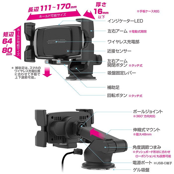| ホールド可能サイズ | 短辺:約64~80mm 長辺:111~170mm 厚み:16mm以下 |