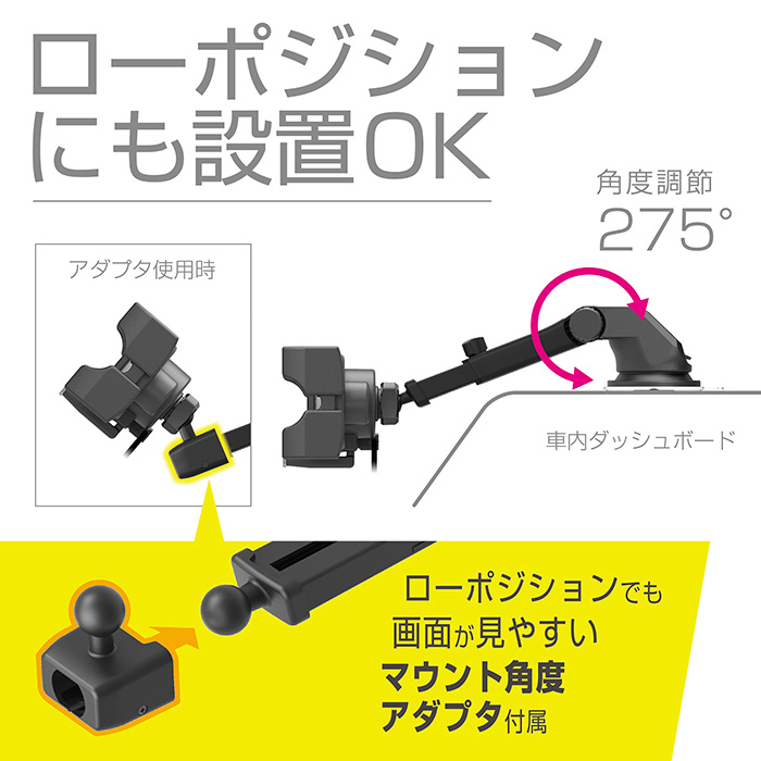 車内のローポジション(低位置)などでも、スマートフォンの画面を見やすい向きに設置可能。