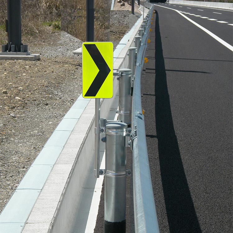 カーブ地点等の危険箇所に設置し、注意喚起を促す曲線部誘導標です 標示板端部はカール加工されており、接触による怪我を最小限に防ぐ歩行者に配慮した構造です
